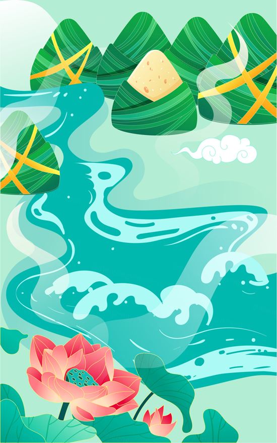图穷联素材库 » 端午节粽子河流荷花莲花场景EPS矢量插画素材