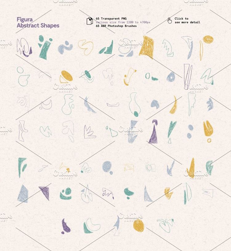 Figura 的灵感来自于抽象绘画中的元素之美、简单的形状、绘画中每一笔笔触的粗糙度。由墨水、画笔和蜡笔制成的真实抽象形状创建。每个形状都扫描成数字版本并精心制作,以获得形状本身的最大形状和细节。如果您在 Figurá 形状内部看到纹理,则可以看到纹理,但要获得最高质量,您可以使用此包中也包含的纹理纹理。