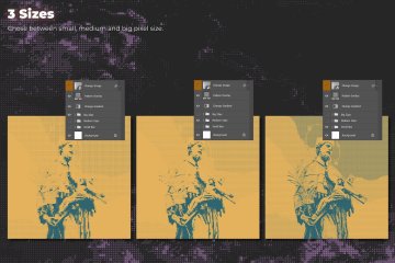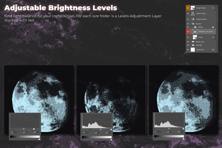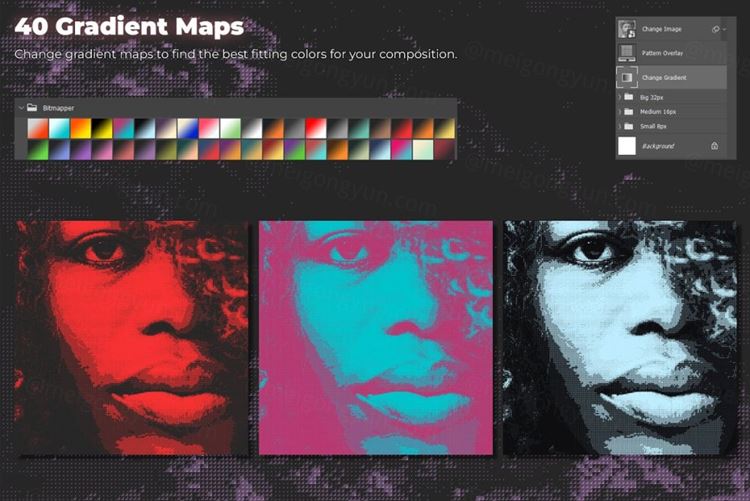 与其他类似产品不同,这不是一个动作包,它是一个带有可编辑和可调整图层的真实 Photoshop 模板。它不只是将您的图像从灰度转换为位图,它还会在智能对象上创建位图效果。您可以自由地尝试颜色、光线、尺寸,以获得您想要的效果并控制整个过程。