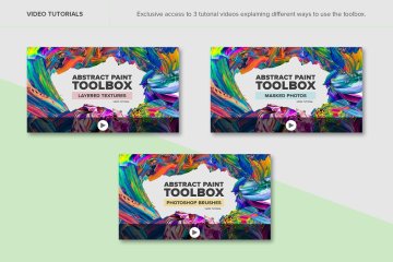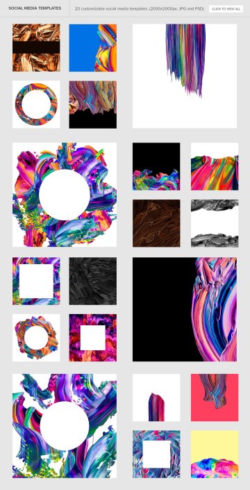 一个包含将抽象绘画带入您的设计所需的一切的包。透明背景、Photoshop 画笔、社交媒体模板、示例 PSD 和视频教程上的 100 幅高分辨率流体画。