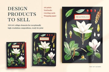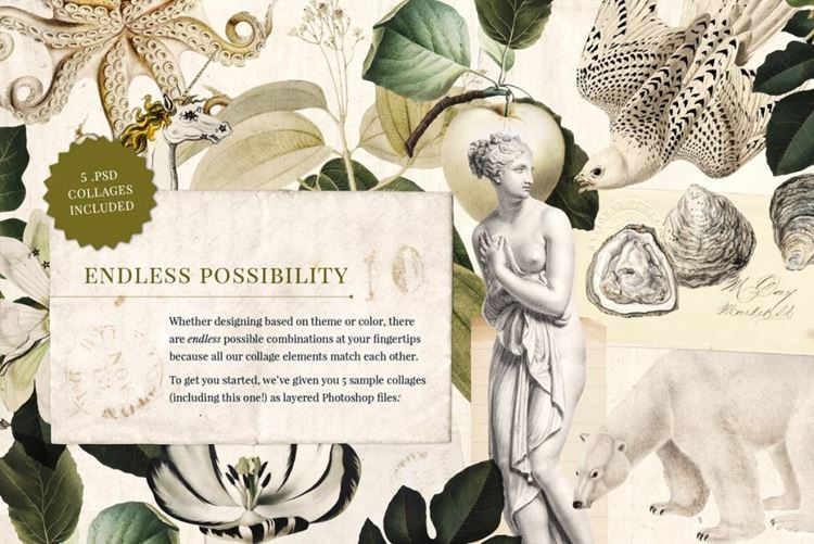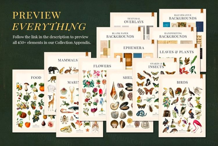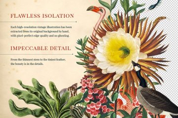 Vintage Collage Creator: The Natural World 包含450 多种高分辨率元素,涵盖范围广泛的类别(如下)。预览我们的收藏附录中的所有元素。
