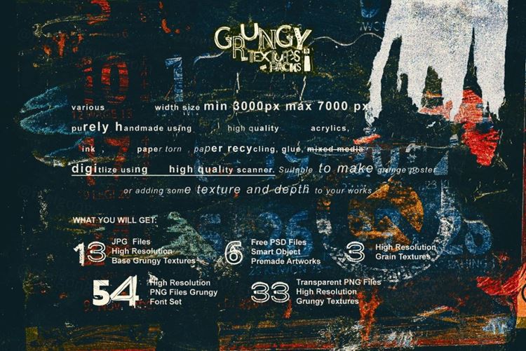 各种宽度尺寸最小 3000 像素最大 7000 像素纯手工制作,使用高品质丙烯酸树脂、墨水、撕纸、纸张回收、胶水、混合媒体使用高品质扫描仪进行数字化。适合制作垃圾海报或为您的作品添加一些纹理和深度。