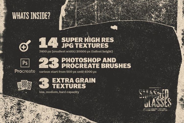 Smashed Glasses Textures是一套完整的碎玻璃纹理。由真正的玻璃制成,并使用数字工具进行增强,以获得最独特的使用方式。通过细节和高分辨率纹理,您可以将其与您的作品结合使用,用于数字和印刷。此包还包括 Photoshop 画笔和 procreate 画笔,为您的作品提供更多灵活性。