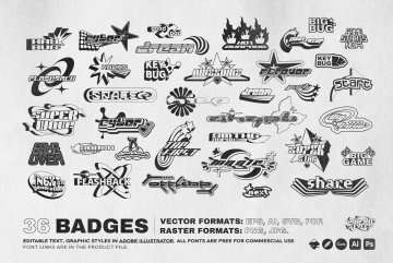 这款高品质工具包的灵感来自 1990 年代和 2000 年代流行趋势中的 Y2K 美学。这里有 240 种独特的矢量图形资产 包括 204 种形状、36 种徽章和用于 Adobe Illustrator 的 33 种额外图形样式。