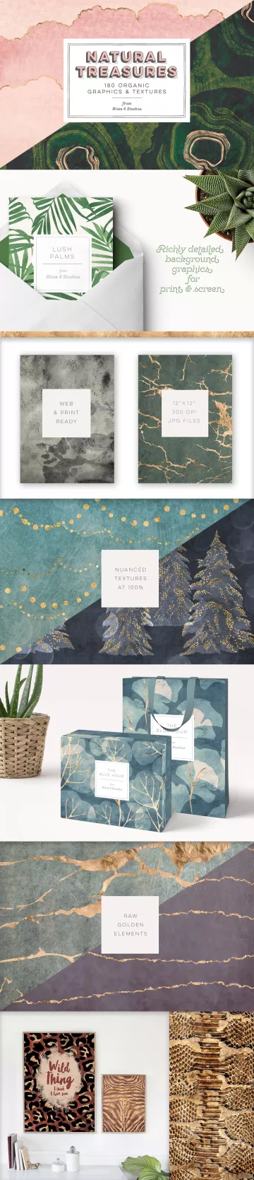 对于这个惊人的有机数字图形宝箱,我收集了我最新的自然宝藏系列——从玫瑰金晶洞、脉纹和接缝大理石到野生猎豹图案和蟒蛇纹理系列,再到有机花卉、沙漠棕榈和仙人掌图形。我已经投入了一些透明的 PNG 和可扩展的 SVG 文件以使交易更加甜蜜,并且对于您在此处看到的所有图形,它的定价仅为 165 美元的单个标价的一小部分。