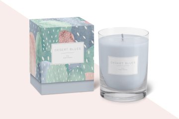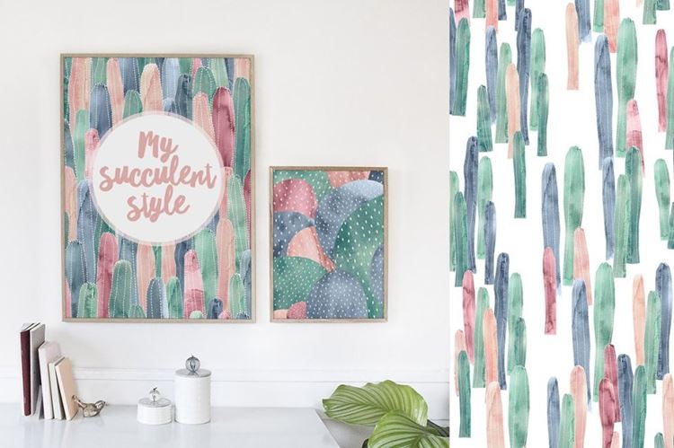 以手绘水彩纹理和玫瑰金金属细节呈现多汁的蓝色、粉红色和绿色仙人掌插图的彩绘景观。