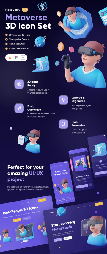 Metaversy 是一组适用于任何 Metaverse Niche 的自定义 3D 图标。使用 3D 图标让您的下一个产品和项目更加精彩。