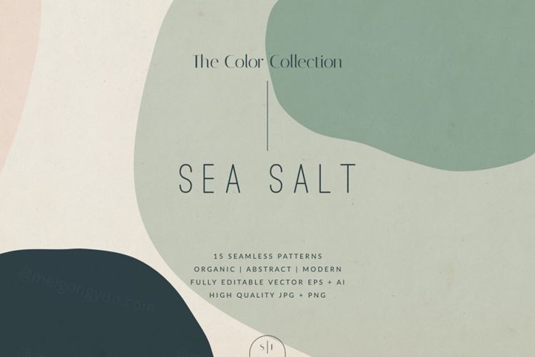 介绍“The Color Collection”中的第二个图案组合“Sea Salt”。它包括 15 种无缝图案,具有梦幻般的海洋水色抽象有机形状。非常适合文具、包装和品牌项目、纺织品、艺术印刷品、网页背景等。