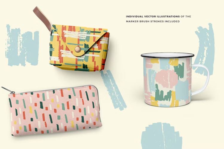 抽象标记笔划是一组无缝矢量图案,具有手绘标记插图 以及 由粗抽象标记线和形状创建的单独手绘插图。有趣、快乐的调色板中的精美选择,具有多种文件格式的可平铺图案,方便使用。