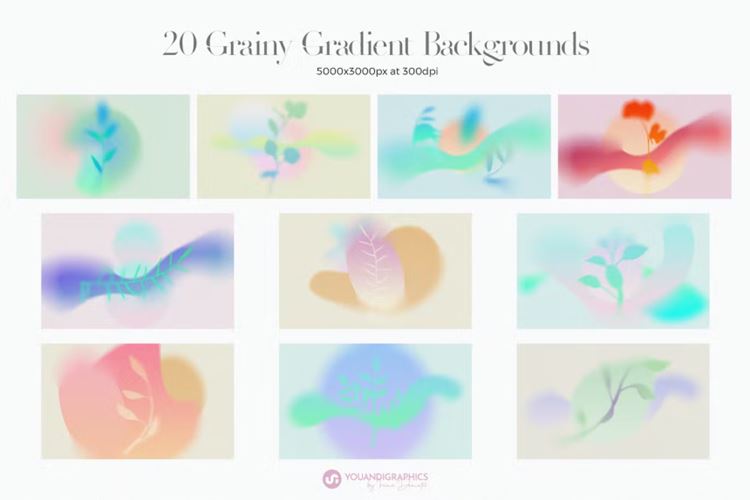 我很高兴向您介绍可爱的 Grainy Gradient Backgrounds一组带有模糊树叶元素的抽象背景。在此集中,您会发现 20 个高分辨率背景,以各种美丽的颜色组合很好地纹理化,这些颜色组合也是可编辑的(在 Adobe Photoshop 中)。我还包含了 60 个单独的 PNG 元素,因此您可以完全发挥创意并提出自己独特的设计:)