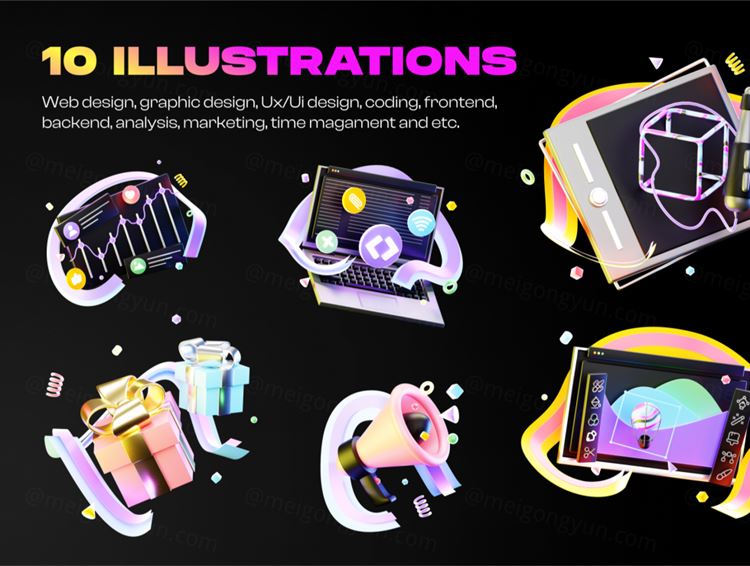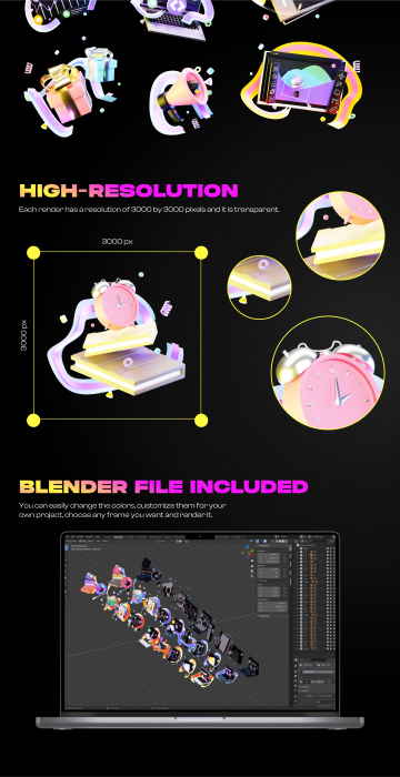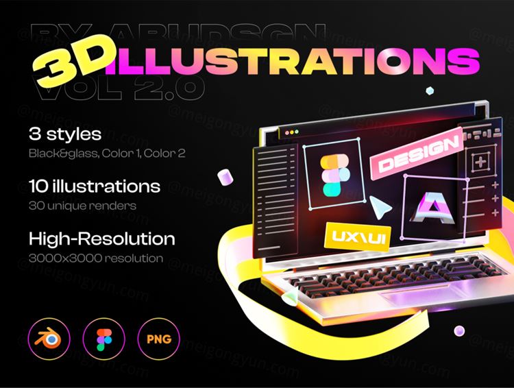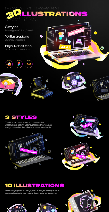 大家好。我很高兴向您展示 3D 插图 V2.0 包。此包包含 3 种风格的 10 张不同插图,并在 Blender Cycles 中渲染。3D 插图易于编辑,可随时根据您的需要使用。使用 3D 插图让您的下一个产品和项目更加惊艳。