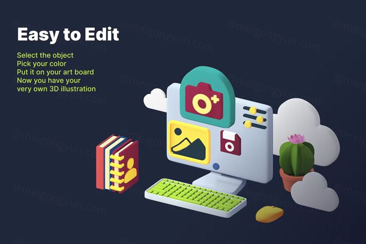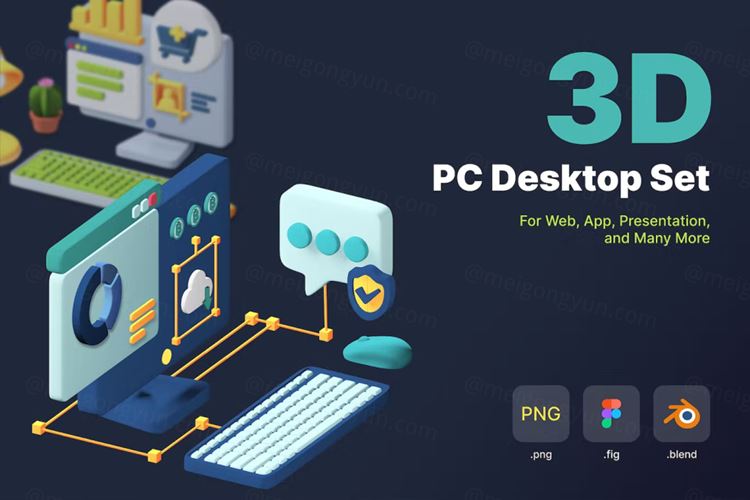 设置您自己的 3D 等距 PC 桌面。您可以找到 50 多个对象,每个对象以 2 个角度呈现。非常适用于任何 Landings、Apps、Presentations 和其他项目。在 Figma 中自定义您自己的颜色。在 Blender 中完全可定制。