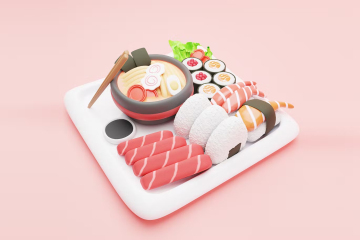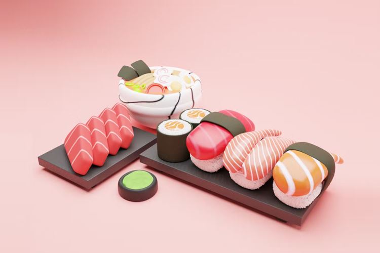 图穷联素材库 » 三维渲染卡通日式寿司面条饭团生鱼片主题3D插画素材 3d J