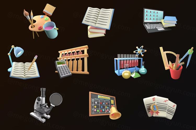 图穷联素材库 » 三维渲染调色盘显微镜算盘学校主题元素3D插画素材 3D Sc