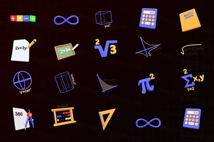 三维渲染珠算公式代数计算器几何数学主题3D图标插画素材 3D