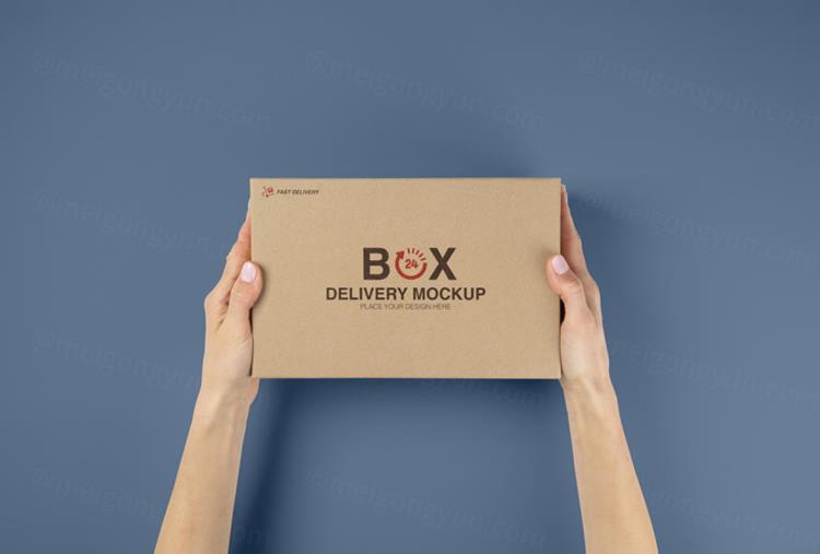 图穷联素材库 » 高质量手持瓦楞纸快递纸箱包装盒贴图设计展示样机PSD模板