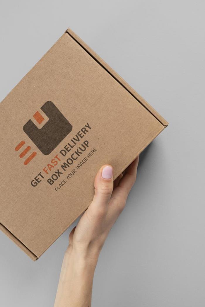 图穷联素材库 » 高质量手持瓦楞纸快递纸箱包装盒贴图设计展示样机PSD模板