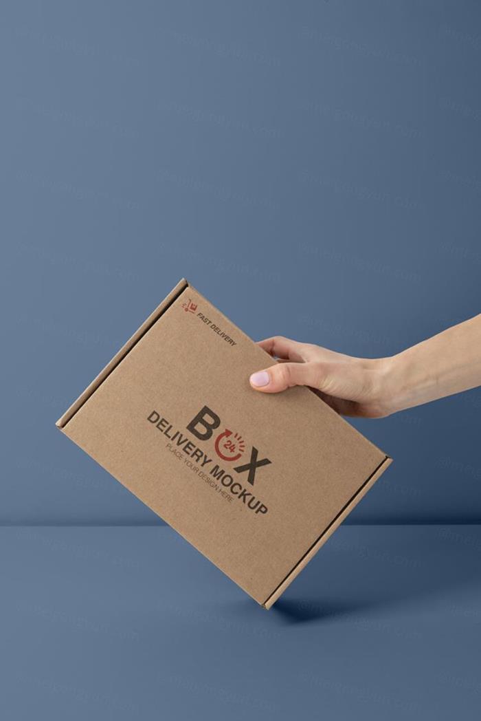 图穷联素材库 » 高质量手持瓦楞纸快递纸箱包装盒贴图设计展示样机PSD模板