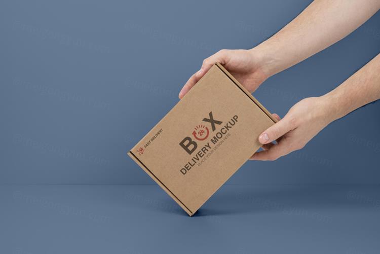 高质量手持瓦楞纸快递纸箱包装盒贴图设计展示样机PSD模板