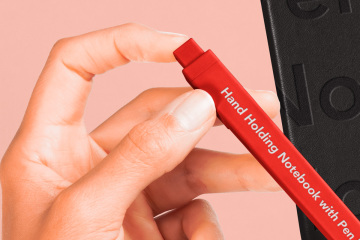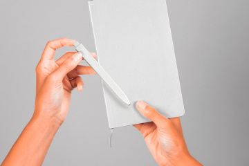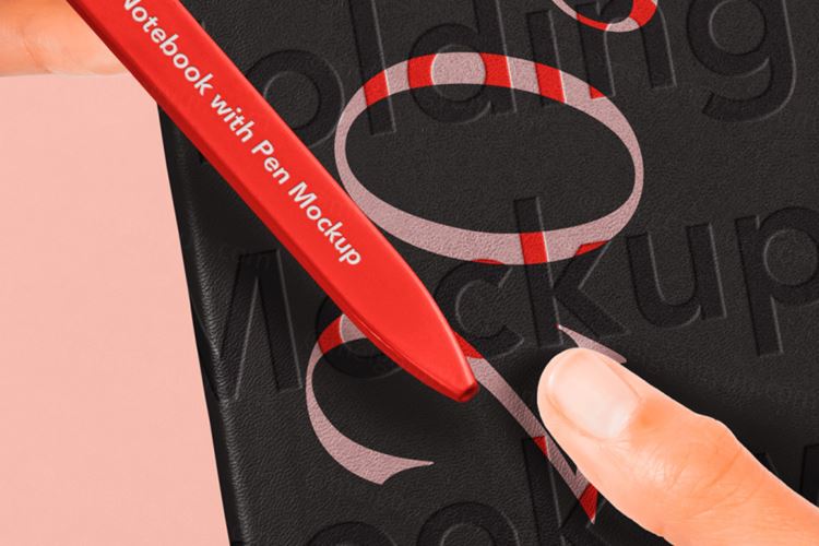 这是一个令人惊叹的 psd 笔记本样机,一只手拿着笔。借助智能层,您可以更改笔记本颜色并添加自己的图形。