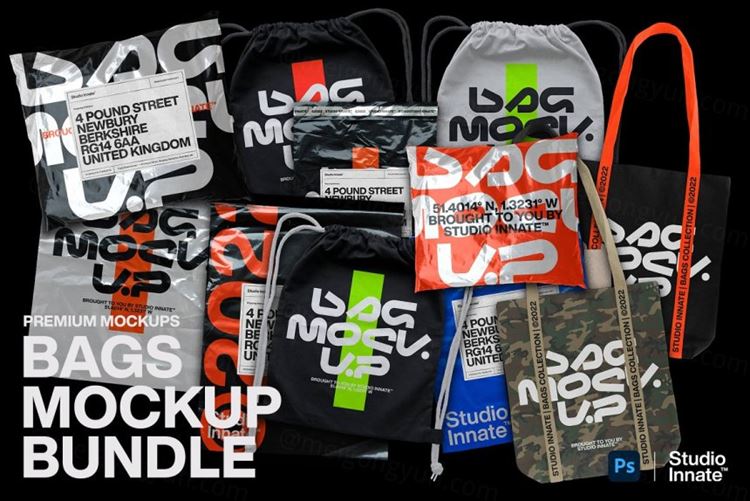 数量: 5 个样机(抽绳运动包、经典手提袋、3 个塑料袋)