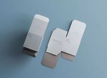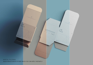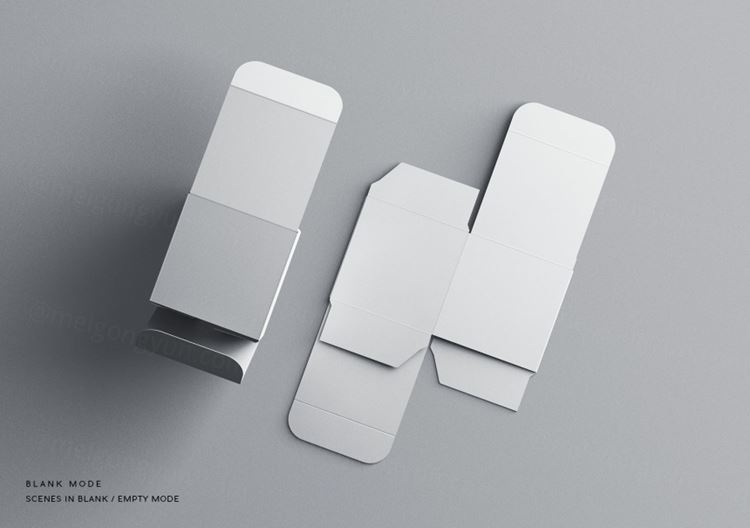 展开的方盒样机;一个基于 Photoshop 的图形,可以立即使用智能对象层进行自定义。该模板包含在我们之前的矩形展开盒模型之后的一系列展开包中。