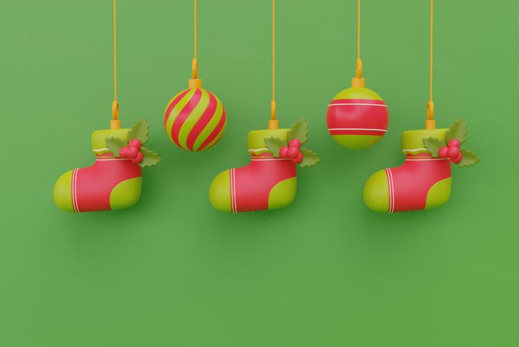 三维渲染可爱卡通圣诞彩球和袜子圣诞节礼盒装饰品元素高清图片素