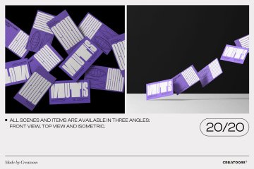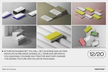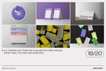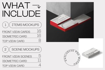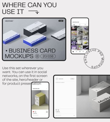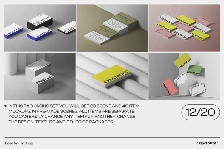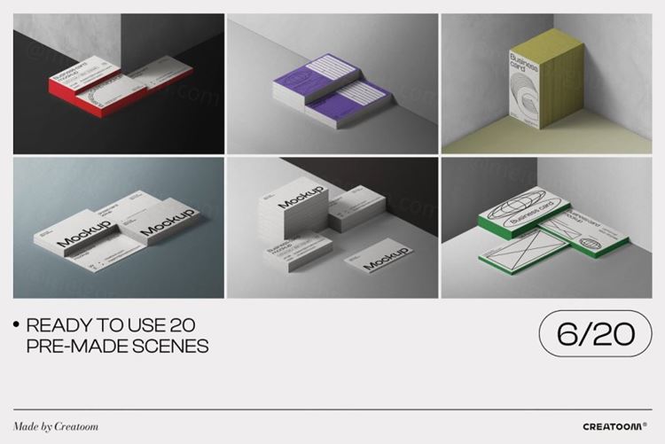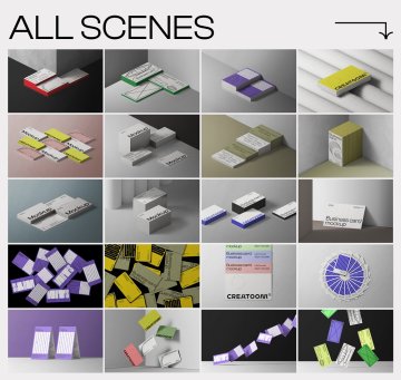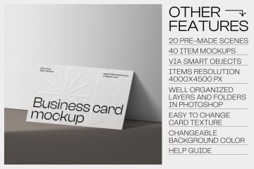 认识新的名片。我们以不同的角度创建了这些卡片,以便您可以创建更详细的演示文稿。得益于超大分辨率 (4000x4500),您可以近距离展示您的名片。在这组中,您将获得 20 个场景和 40 个卡片模型。借助智能对象层,只需单击几下即可粘贴您的设计。您可以轻松更改卡片的纹理、颜色、边缘和背景。