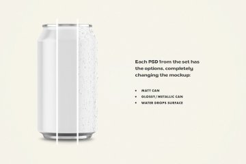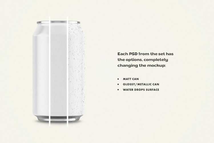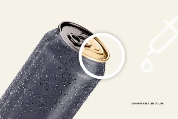 通过有效使用智能对象,所有定制机会都为您服务。选择3 个给定的罐头角度之一,为您的项目提供最有益的方面。然后,您可能会想要使用3 种表面纹理,并将您的罐子涂上光滑的金属光泽、亚光盖或洒上水滴。在这个可爱的模型的帮助下查看您的图标、标识、图案或插图会很整洁!