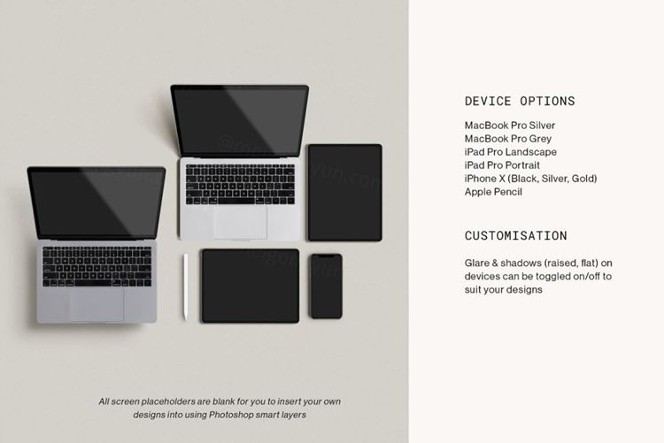 3 种设备可供选择:MacBook(银色、灰色)、iPhone(黑色、银色、金色)、iPad(纵向和横向)