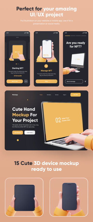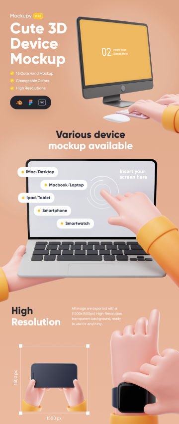 Mockupy 是一套适用于任何项目的自定义 3D 设备模型。采用可爱的风格,提供多种可供选择的设备模型。