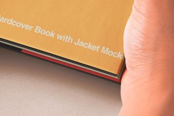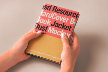 这是一本高质量的 psd 精装书样机,带有防尘套和手拿着它。您可以轻松添加任何图形,通过智能层使其成为您自己的图形。