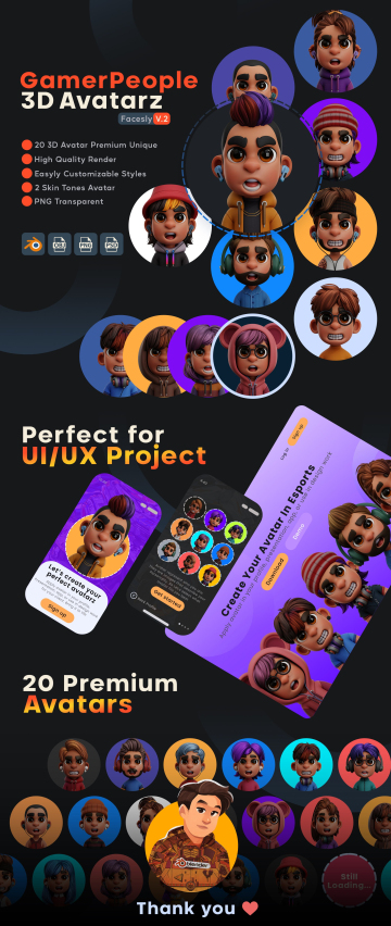 大家好,这个产品包是 Gamer People/Avatar 3D Illustration,它是一个定制的 3D Avatar,适合电子竞技配置文件需求、个人配置文件或 UI/UX 项目、社交媒体,并且可用于您的设计工作。使用 3D 头像图标让您的下一个产品和项目更加惊艳,快乐享受!