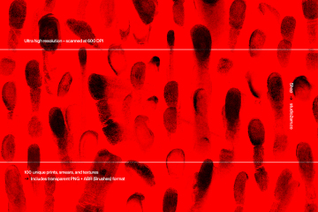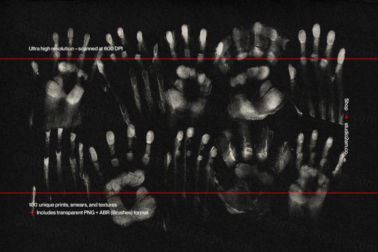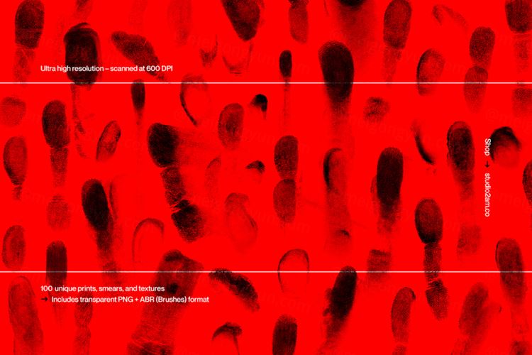 此包包括 100 多种独特的手指、手和涂抹纹理,以 600DPI 扫描并以透明 PNG 和 ABR 画笔格式提供。这些高分辨率指纹纹理非常适合寻找独特纹理以添加到他们的背景的设计师,或希望为他们的插图添加一些真实感的插画家!