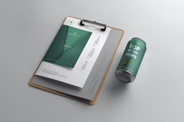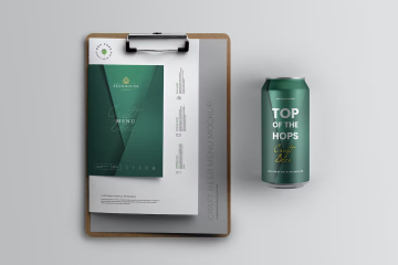 包装 PSD 样机模板集合,包括啤酒罐、瓶子、玻璃器皿、啤酒垫、啤酒花、菜单和不同的品牌元素,非常适合啤酒厂、酒吧、零售店或精酿啤酒行业相关的品牌项目。