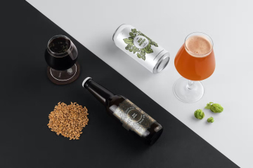 包装 PSD 样机模板集合,包括啤酒罐、瓶子、玻璃器皿、啤酒垫、啤酒花、菜单和不同的品牌元素,非常适合啤酒厂、酒吧、零售店或精酿啤酒行业相关的品牌项目。