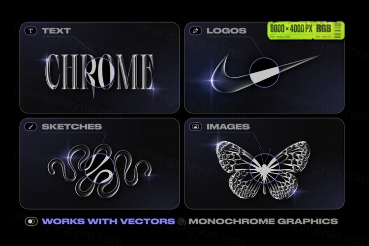 创建视觉上令人愉悦的金属徽标、时尚字体、图标、抽象形状、现代艺术品、视觉标识等等!在 4 种镀铬预设之间选择您的 3D 风格:银色、哑光黑色、边缘光和水星。