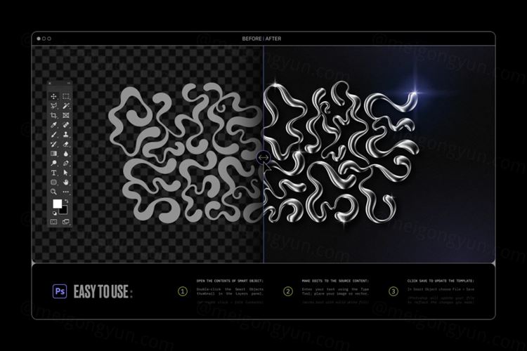 无论您是专业的 Photoshop 用户还是刚开始您的第一次创意冒险,此模板都具备您只需单击几下即可轻松将 chrome 3D 效果应用于您自己的图形所需的一切!