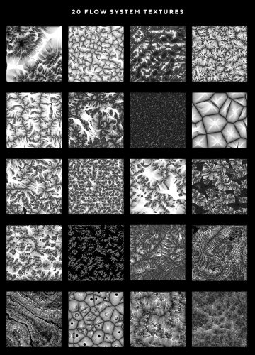 Flow Systems 是 20 种抽象分形纹理的集合。由于这些资源是高分辨率的,因此它们在打印或网络图形中效果很好。在华丽的宏观细节上使用完整的作品或裁剪。由于每件作品都在透明背景上,您可以轻松地将它们与文本和其他艺术品和对象分层