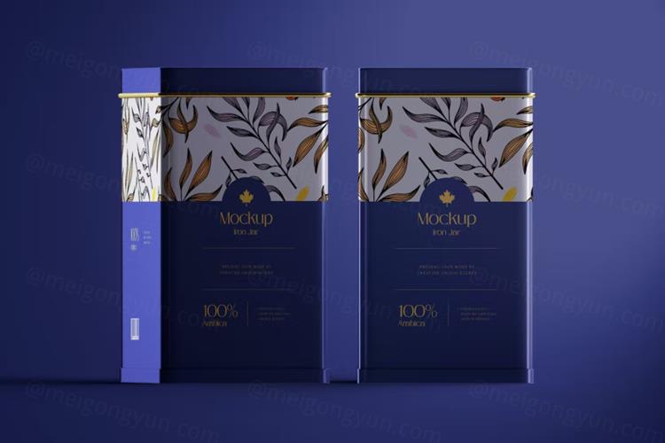 图穷联素材库 » 高质量方形金属茶罐咖啡茶叶包装设计贴图展示样机PSD模板 S