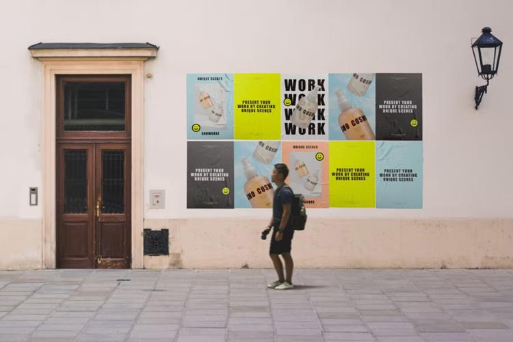 图穷联素材库 » 户外皱巴巴的宣传单海报墙面广告设计贴图展示样机PSD模板 W