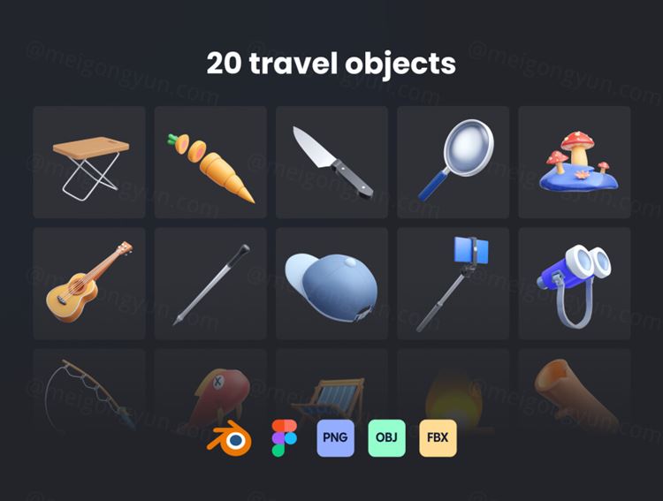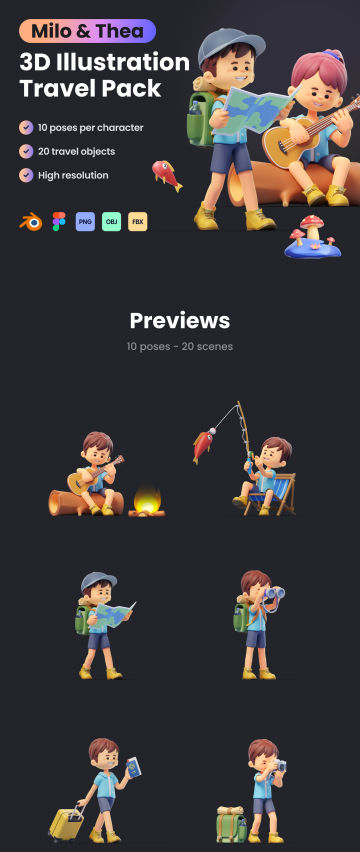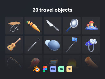 通过一组 3D Illustration Travel 让您的项目栩栩如生,轻松将资产拖放到 Figma 库中,并在 Blender 中完全自定义或轻松导入到另一个具有 OBJ 和 FBX 格式的 3D 设计应用程序。