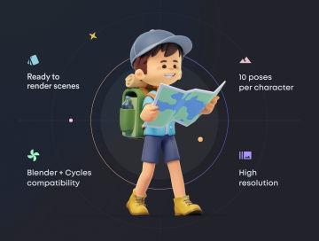 这个很棒的包包括 2 个完全绑定的角色,每个角色有 10 个不同的姿势,以及 20 个对象,只需在 Blender + Cycles 渲染引擎中单击一下即可渲染。