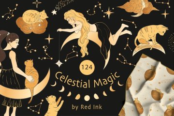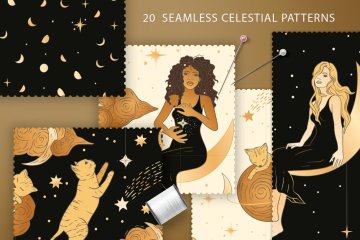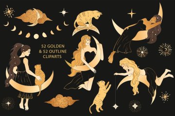 这个庞大的系列包括 124 张手绘的天体插图,有美丽的女人、猫、太阳和月亮、星星和十二生肖。所有这些元素都是魔法儿童和成人项目的完美补充。他们可以出现在从文具到美丽的墙壁艺术甚至时尚服装的任何事物上!用它来为您的项目添加不寻常的流行效果和天体戏剧。