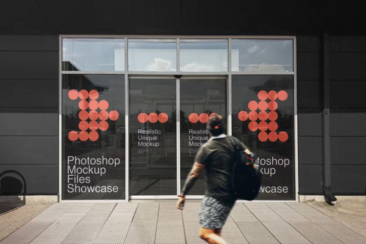 图穷联素材库 » 商铺门口玻璃橱窗广告海报设计贴图展示样机模板 Adverti