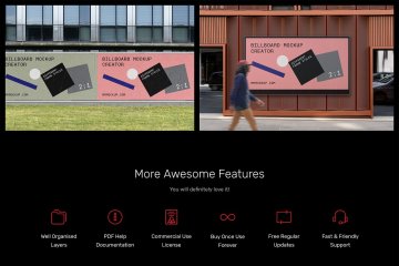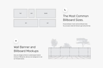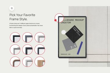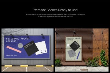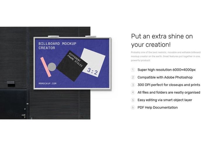 使用我们的 Billboard Mockup Creator 让您的广告牌展示更具吸引力!可能是地球上最逼真、可移动和可编辑的广告牌模型创建者之一。9 种框架样式和 11 种不同的纸张纹理可供选择。在 5 种最常见的广告牌尺寸之间进行选择。您可以轻松旋转框架以获得垂直格式。自定义海报演示文稿的设计从未如此简单快捷。将您的设计打印在宽阔的防水油布横幅模型或 OSB 面板上。添加您自己的背景或使用我们的预制场景。20 种自然阳光/阴影,让您的场景看起来更逼真。调整不透明度、大小和角度以获得无数结果。我们精心制作了 16 个预制场景,让您有一个更好的开始。只需将设计替换到智能对象层,点击保存即可。强大的功能集于一身,功能强大的产品!超高分辨率6000×4000px。300 DPI 非常适合特写和打印。通过智能对象层轻松编辑。与 Adobe Photoshop 兼容。所有文件和文件夹都井井有条。PDF 帮助文档。