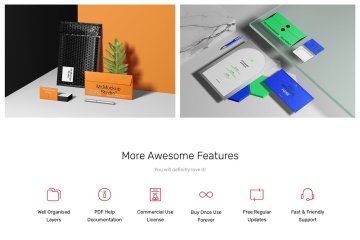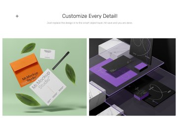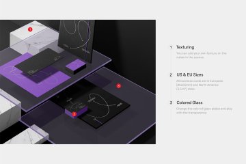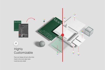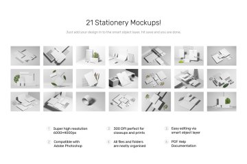 使用我们的文具模型让您的文具设计演示更具吸引力!所有物体和阴影都完全分离,因此您可以轻松玩转它们。隐藏项目并裁剪图像以创建您自己的独特场景。您可以轻松地将一些纸质卡片替换为透明亚克力卡片。在所有场景中都有您可以轻松编辑或删除的额外项目。您可以在场景中的立方体上添加自己的纹理。改变玻璃板的颜色并玩弄透明度。借助智能对象层,只需单击几下即可放置您的设计。定制每一个细节!你一定会爱上它!