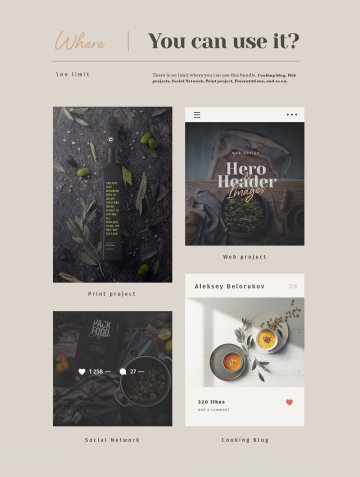 烹饪博客、Web 项目、社交网络、打印项目、演示文稿等。