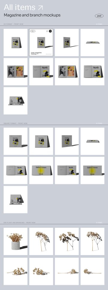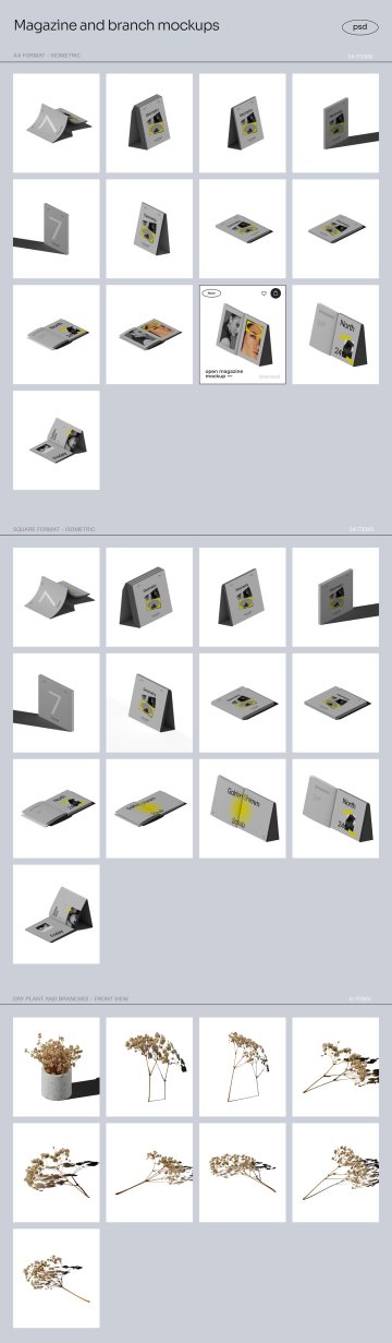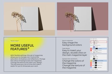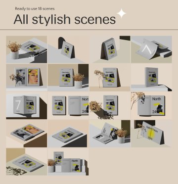 3 个角度的现代简约杂志样机套件。自定义您想要的方式:控制阴影和反射的饱和度。更改背景和杂志的颜色。更改纹理并插入您的设计。这将为您节省大量时间,并使您更容易展示您的作品。