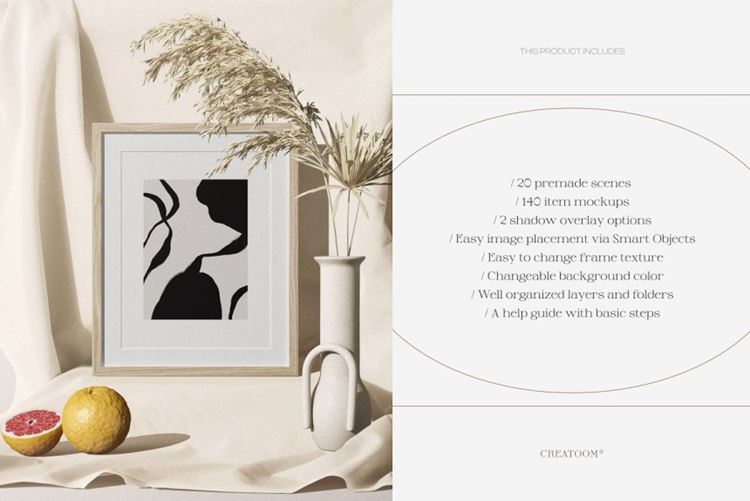 介绍具有自然光照和阴影的现代逼真框架样机创建者 - 第 1 部分。太阳阴影使场景看起来逼真而现代。使用 140 个独立的项目,您可以创建独特而逼真的场景。20 个准备好的场景将帮助您更快上手。